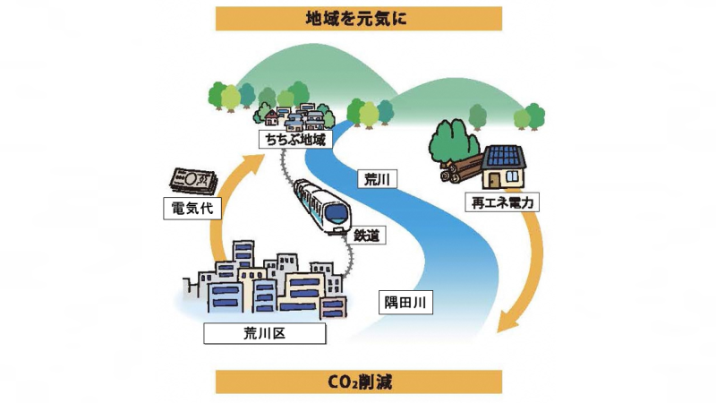 荒川区からは、区内における再生可能エネルギー(再エネ)の設置可能量が限られている中、秩父新電力がちちぶ産再エネ等を仕入れて供給する、より排出係数※1が低くかつ低廉な電力を受給することによって、区内の低炭素化を推進できる点に賛同いただきました。一方で秩父新電力は、荒川区からの電気代収益をちちぶ地域の経済活性化に結びつけていきたいと思います。また、これまでも荒川区と秩父市は姉妹都市として、自治体間で各種の交流事業を行なってきましたが、今回新しく電力のつながりが生まれたことを契機として、荒川区の子ども達にちちぶ地域でエネルギー学習をしていただく等、秩父新電力が関わる形で地域間交流の促進を目指していきます。