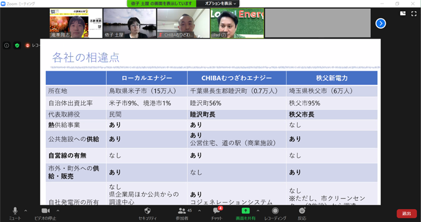 今回は、自治体出資比率が異なる、米子市・ローカルエナジー(自治体10%出資)、睦沢町・CHIBAむつざわエナジー(55%出資)、秩父新電力(95%出資)の共同登壇形式にして、ガバナンスの違いを探るという面白い企画でした。